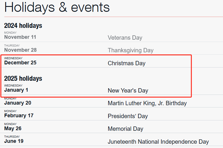 尊敬的客户,美国时间12月25日(周三)Christmas Day、1月1日(周三)New Year's Day,各放假一天。